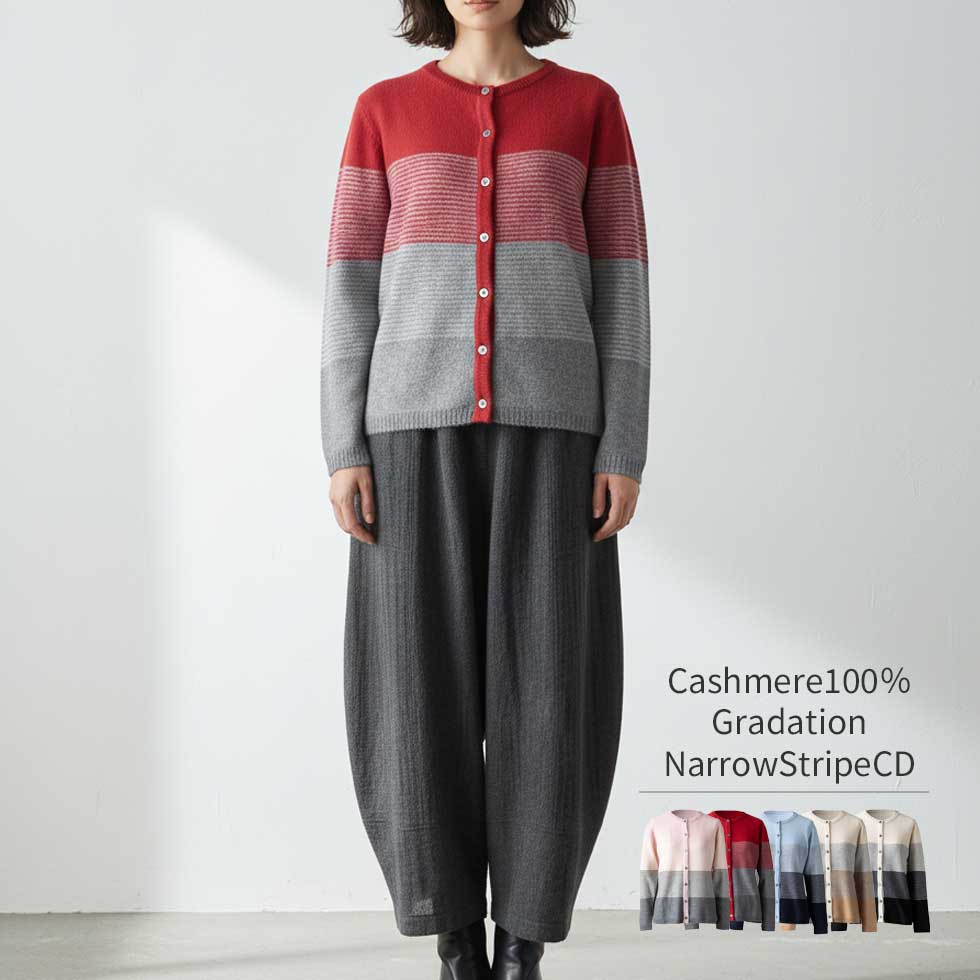 カシミヤ100%グラデ―ションナローボーダーカーディガン